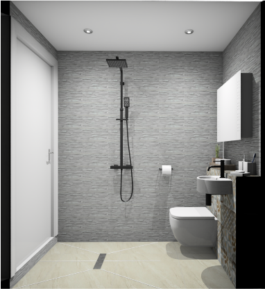 This design was created for a client who had a small space available to create a bedroom and en-suite wet room for an elderly family member. I strategically placed the toilet and basin on the back wall, and suggested a step down into the room to prevent water from escaping into the bedroom, ensuring a functional and safe space for the client's loved one.